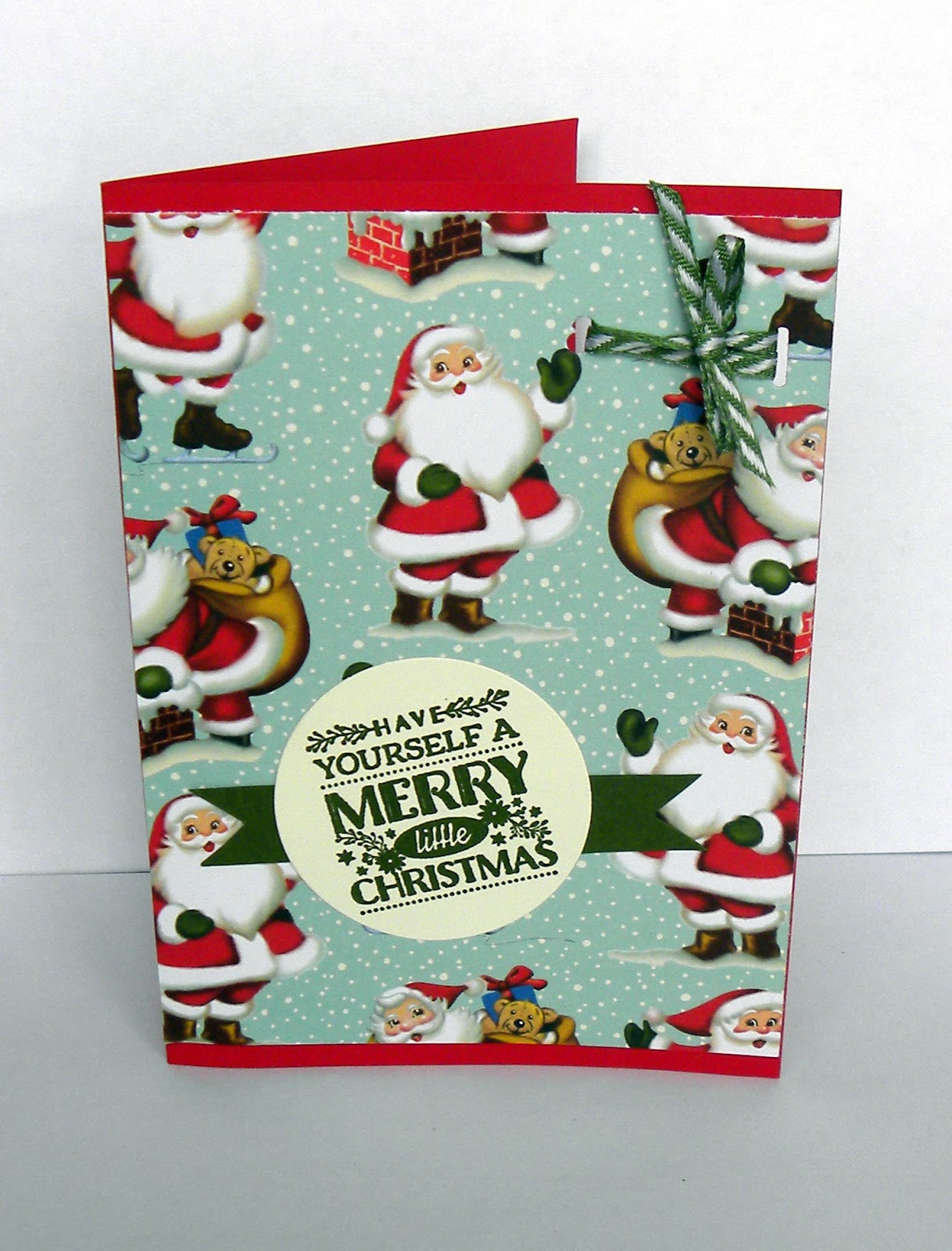 I stamped the santa and reindeer on the base of the card in Cherry Cobbler, then added the DSP which I cut at 14.4cm x 8 cm. I stamped the sentiment on Very Vanilla (in Cherry Cobbler) and added some of the Home for Christmas Enamel dots